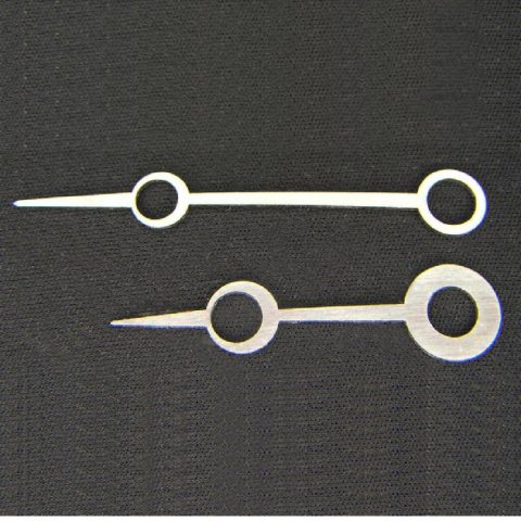 The hour hand is 40mm from tip to centre of mounting hole. The minute hand is 53mm from tip to centre of mounting hole. Both will need to be polished & blued and have collets made to fit.